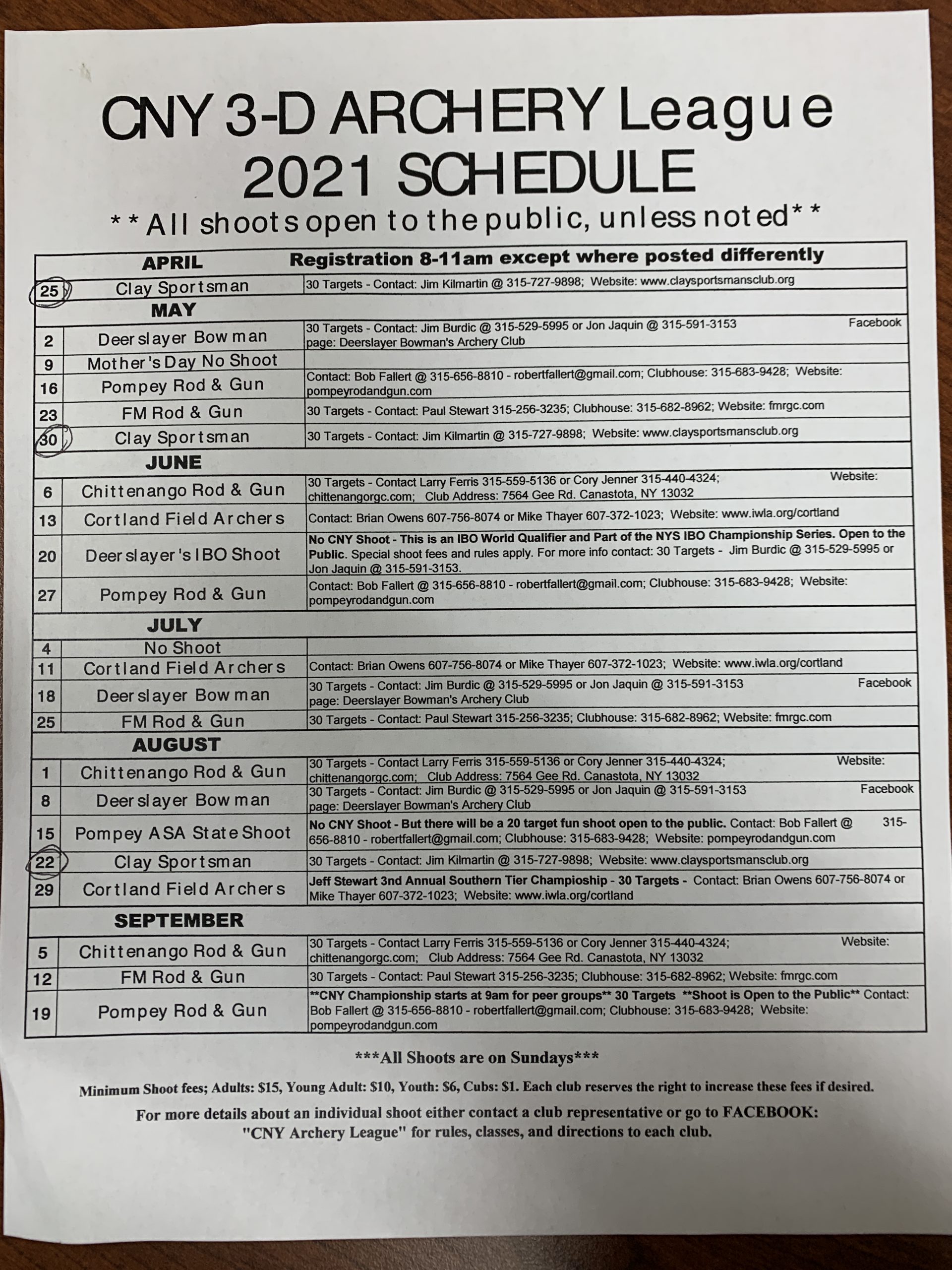 April 25 -Clay Sportsmans Club – 30 Targets contact Jim Kilmartin – 315-727-9898